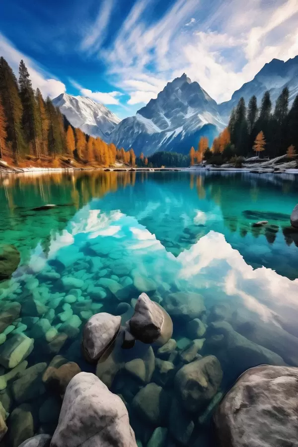 Poster Bergsee mit türkisfarbenem Wasser und herbstlichen Lärchen Nr f46517