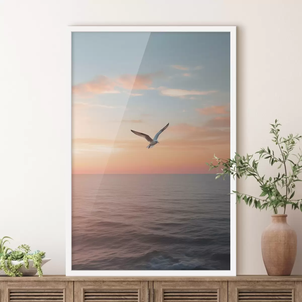 Poster Möwe über dem Meer bei einem rosa-pfirsichfarbenen Sonnenuntergang Nr f46520