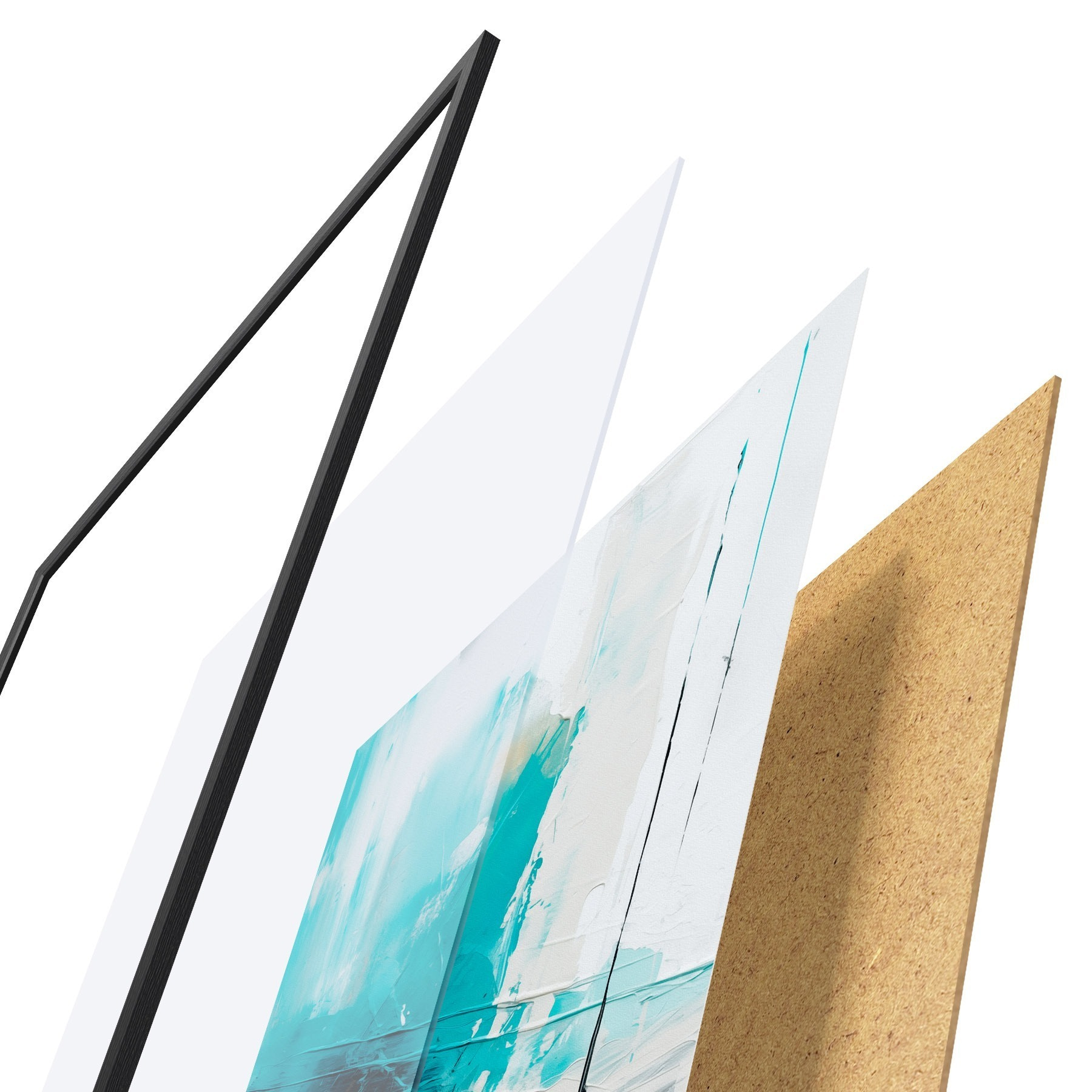 Das Poster besteht aus einem Rahmen, Plexiglas, einem gedruckten Bild und einer Rückwand aus Spanplatten. Dank der Halterungen auf der Rückseite kann das Poster sofort an die Wand gehängt werden.