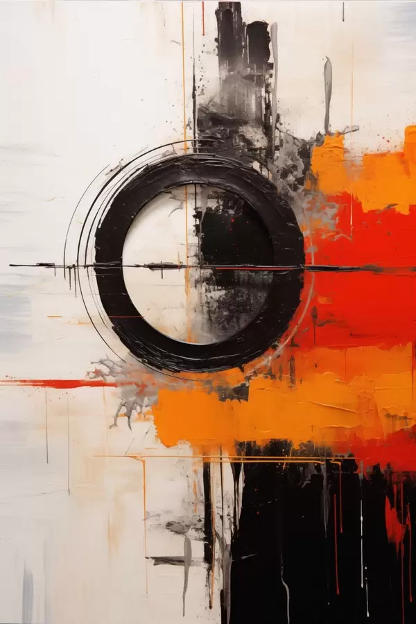 Poster Schwarzer Kreis auf weißem Hintergrund, orangefarbene Striche und Spritzer Nr f46549