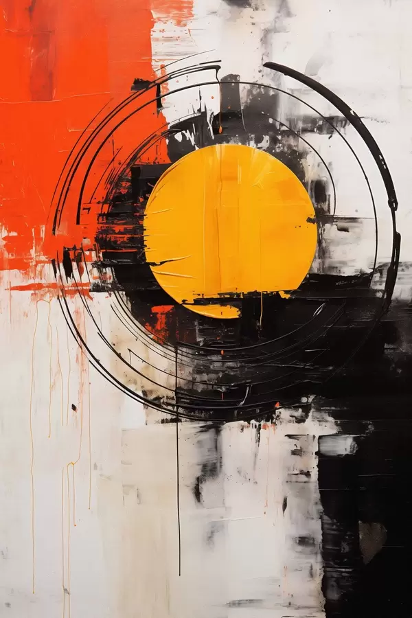 Poster Orangefarbene Scheibe innerhalb eines schwarzen Rings, Striche und Spritzer Nr f46550