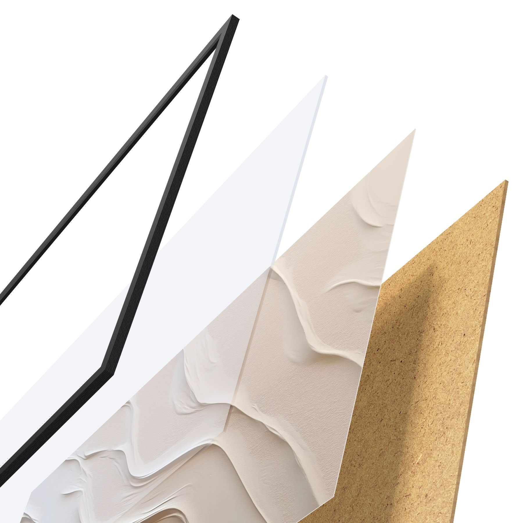 Das Poster besteht aus einem Rahmen, Plexiglas, einem gedruckten Bild und einer Rückwand aus Spanplatten. Dank der Halterungen auf der Rückseite kann das Poster sofort an die Wand gehängt werden.