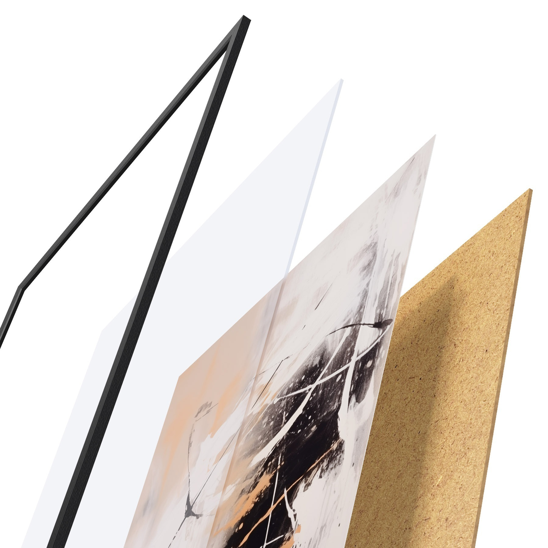 Das Poster besteht aus einem Rahmen, Plexiglas, einem gedruckten Bild und einer Rückwand aus Spanplatten. Dank der Halterungen auf der Rückseite kann das Poster sofort an die Wand gehängt werden.