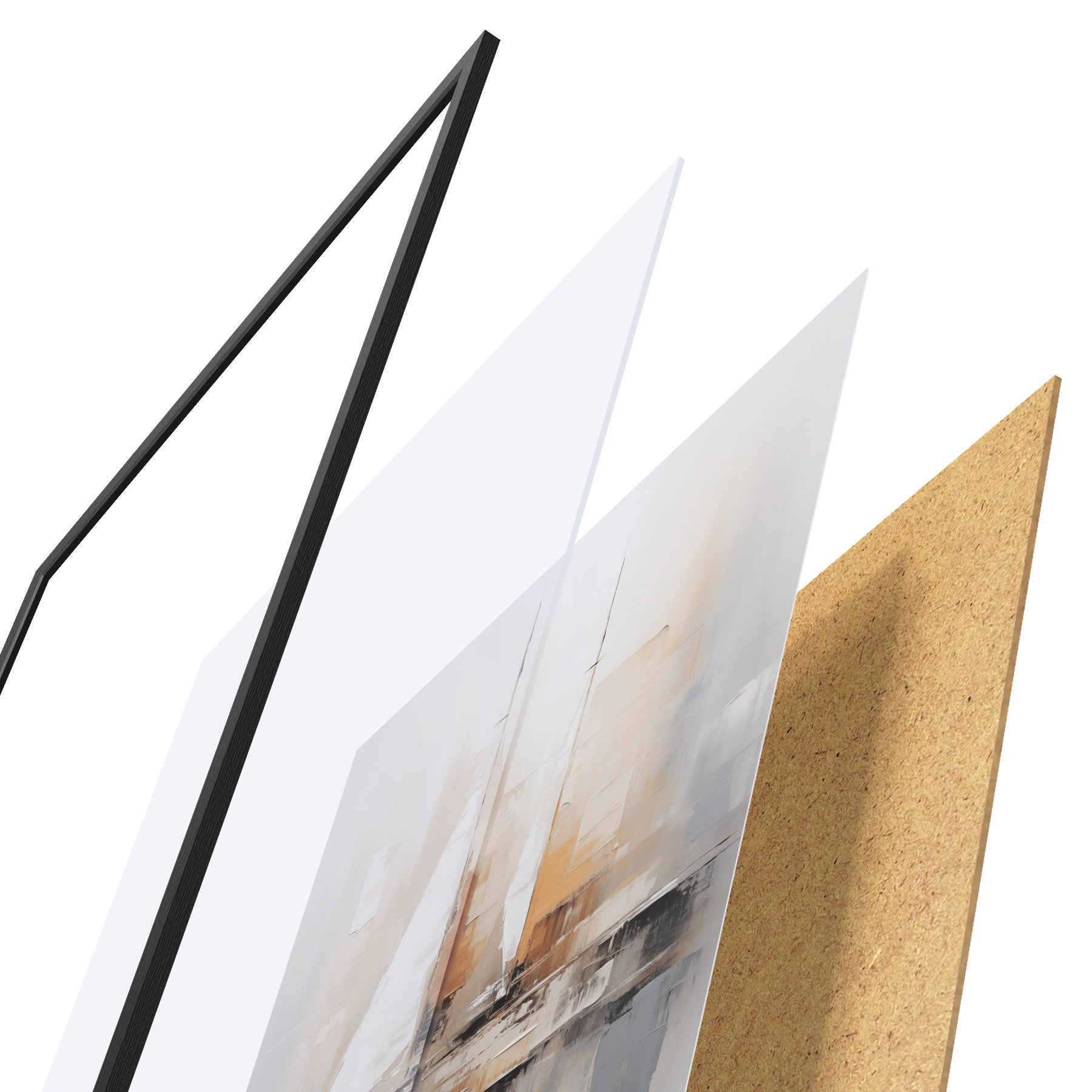 Das Poster besteht aus einem Rahmen, Plexiglas, einem gedruckten Bild und einer Rückwand aus Spanplatten. Dank der Halterungen auf der Rückseite kann das Poster sofort an die Wand gehängt werden.