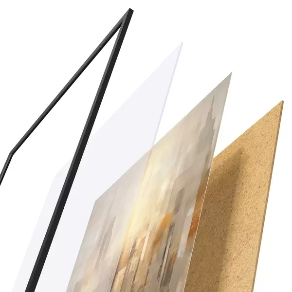 Das Poster besteht aus einem Rahmen, Plexiglas, einem gedruckten Bild und einer Rückwand aus Spanplatten. Dank der Halterungen auf der Rückseite kann das Poster sofort an die Wand gehängt werden.