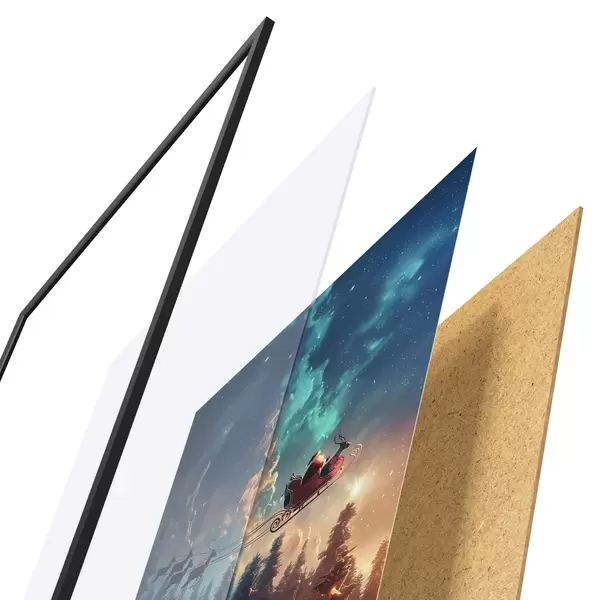 Das Poster besteht aus einem Rahmen, Plexiglas, einem gedruckten Bild und einer Rückwand aus Spanplatten. Dank der Halterungen auf der Rückseite kann das Poster sofort an die Wand gehängt werden.
