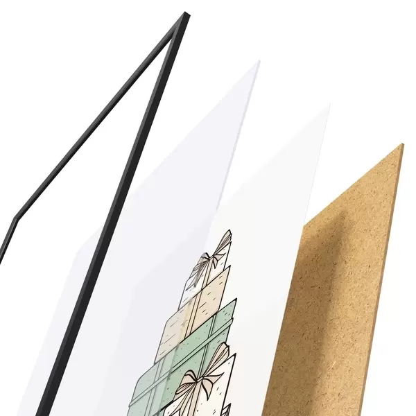 Das Poster besteht aus einem Rahmen, Plexiglas, einem gedruckten Bild und einer Rückwand aus Spanplatten. Dank der Halterungen auf der Rückseite kann das Poster sofort an die Wand gehängt werden.