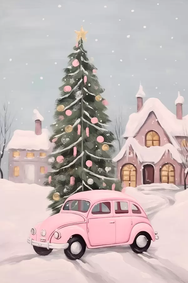 Poster Rosa Auto und geschmückter Weihnachtsbaum vor dem Haus Nr f46621