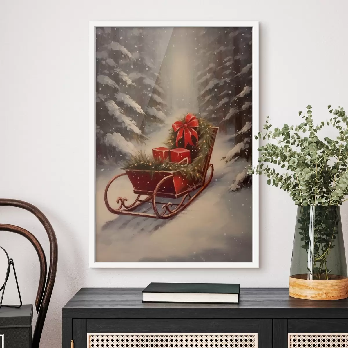 Poster Weihnachtsschlitten mit Geschenken in einem verschneiten Wald f46630