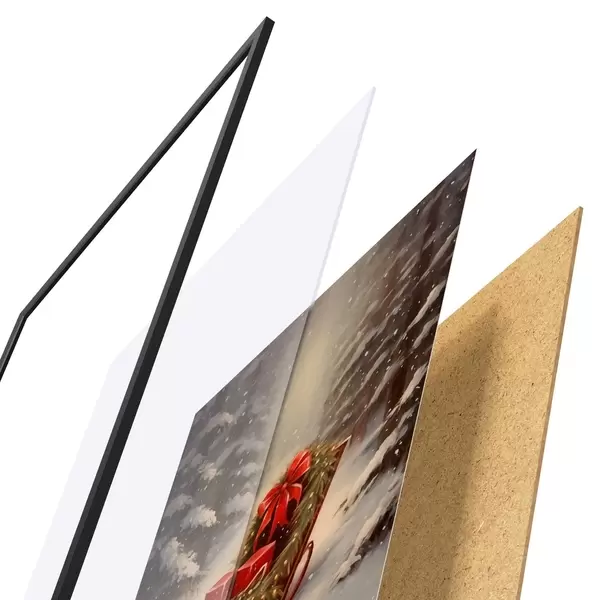 Das Poster besteht aus einem Rahmen, Plexiglas, einem gedruckten Bild und einer Rückwand aus Spanplatten. Dank der Halterungen auf der Rückseite kann das Poster sofort an die Wand gehängt werden.