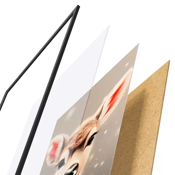Das Poster besteht aus einem Rahmen, Plexiglas, einem gedruckten Bild und einer Rückwand aus Spanplatten. Dank der Halterungen auf der Rückseite kann das Poster sofort an die Wand gehängt werden.