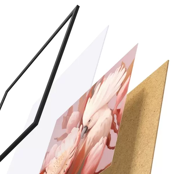 Das Poster besteht aus einem Rahmen, Plexiglas, einem gedruckten Bild und einer Rückwand aus Spanplatten. Dank der Halterungen auf der Rückseite kann das Poster sofort an die Wand gehängt werden.