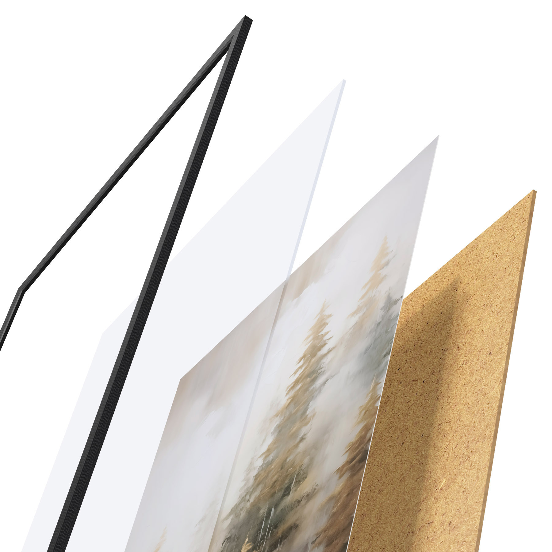 Das Poster besteht aus einem Rahmen, Plexiglas, einem gedruckten Bild und einer Rückwand aus Spanplatten. Dank der Halterungen auf der Rückseite kann das Poster sofort an die Wand gehängt werden.