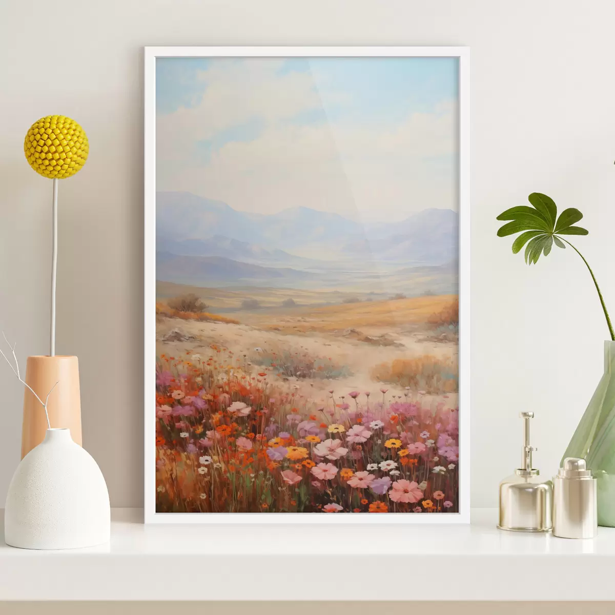 Poster Landschaft, ein Feld voller bunter Blumen mit Bergen im Hintergrund, sanfte Pastellfarben Nr f46685