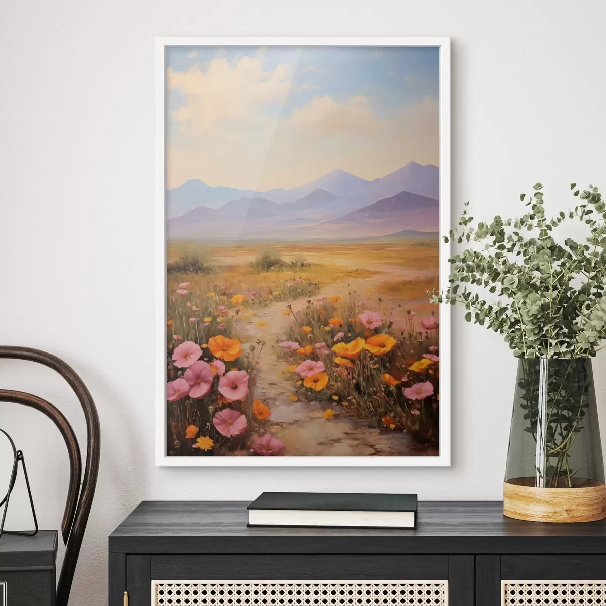 Poster Landschaft, ein Feld voller bunter Blumen mit Bergen im Hintergrund, sanfte Pastellfarben Nr f46686