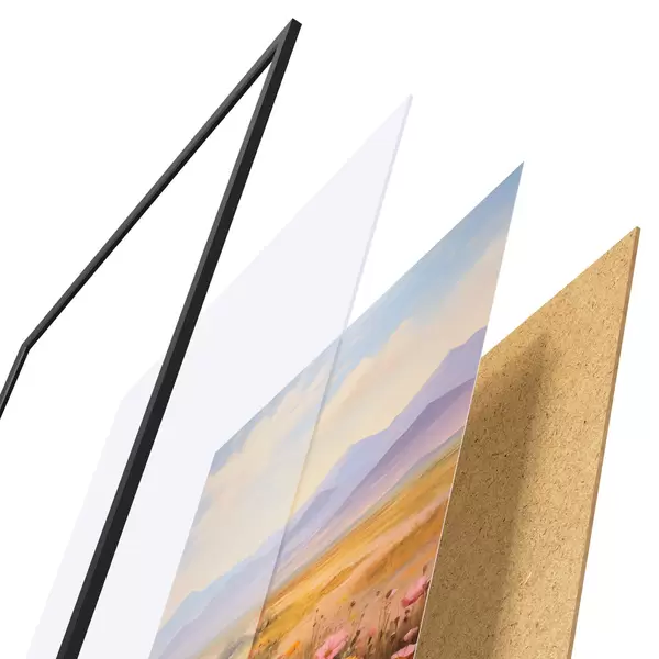 Das Poster besteht aus einem Rahmen, Plexiglas, einem gedruckten Bild und einer Rückwand aus Spanplatten. Dank der Halterungen auf der Rückseite kann das Poster sofort an die Wand gehängt werden.