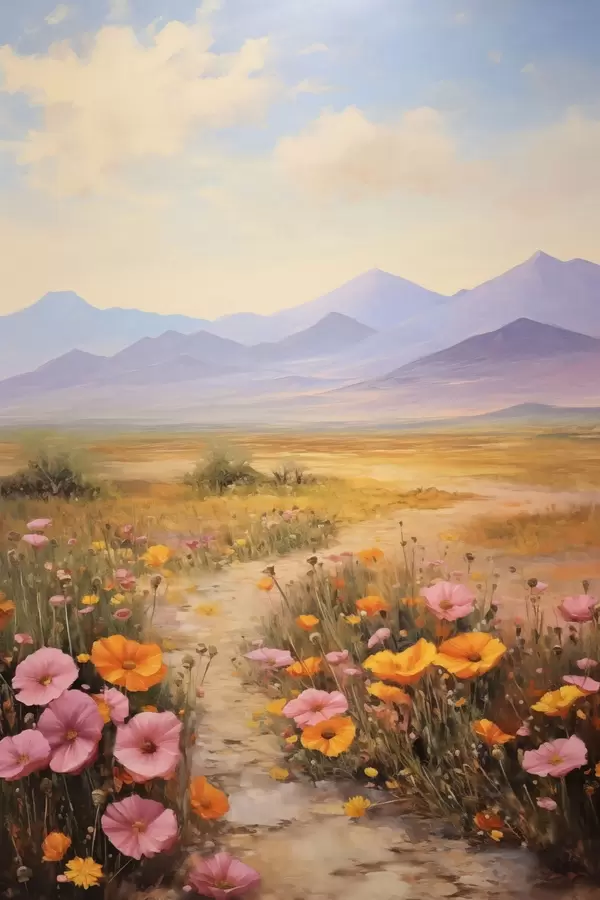Poster Landschaft, ein Feld voller bunter Blumen mit Bergen im Hintergrund, sanfte Pastellfarben Nr f46686