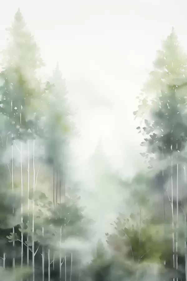 Poster Aquarellmalerei, die einen abstrakten Wald mit hohen Bäumen und grünem Laub imitiert, in sanften, gedämpften Farben Nr f46689