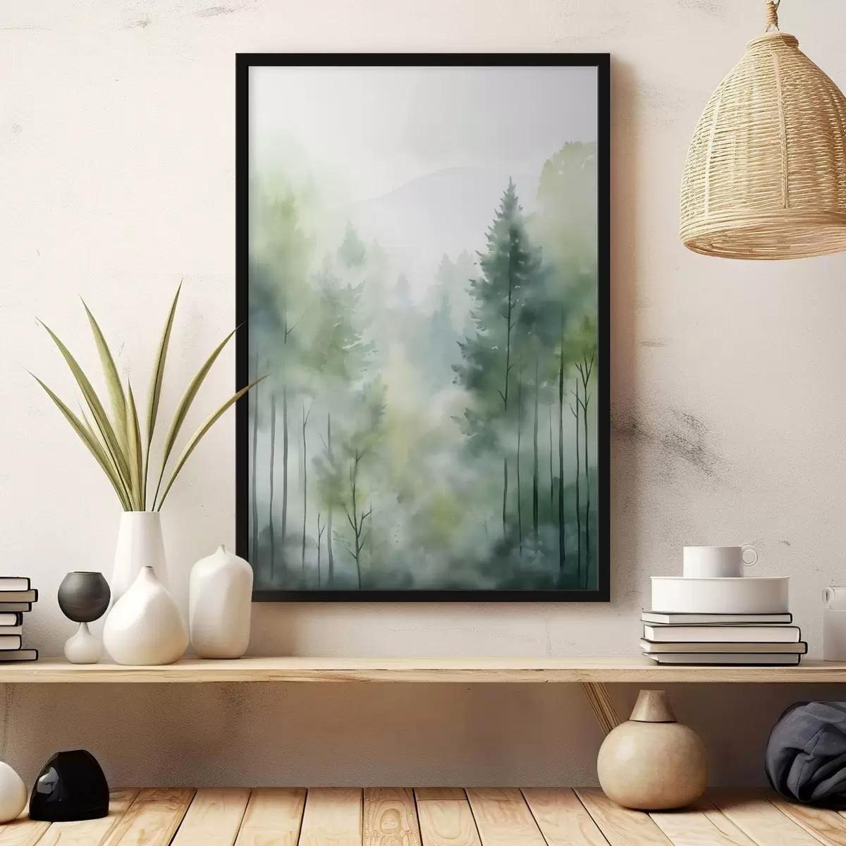 Poster Aquarellmalerei, die einen nebligen Wald mit hohen Kiefern und Bergen im Hintergrund darstellt Nr f46690