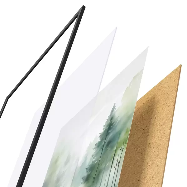 Das Poster besteht aus einem Rahmen, Plexiglas, einem gedruckten Bild und einer Rückwand aus Spanplatten. Dank der Halterungen auf der Rückseite kann das Poster sofort an die Wand gehängt werden.