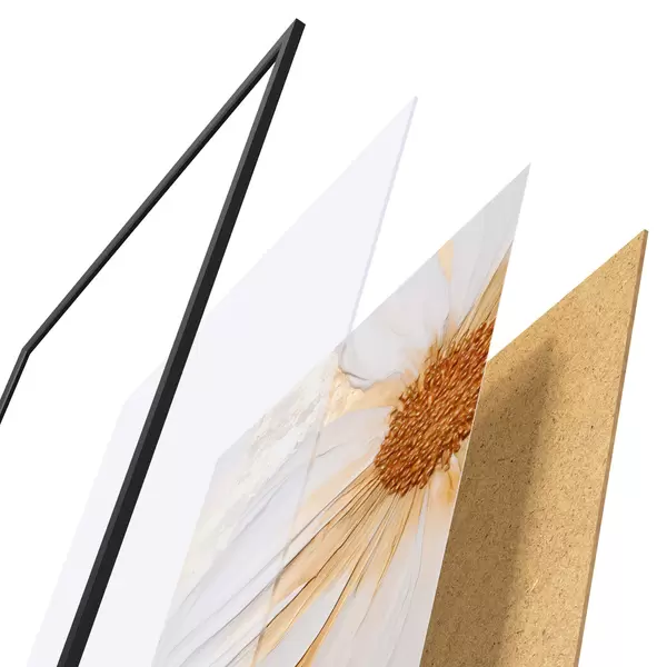 Das Poster besteht aus einem Rahmen, Plexiglas, einem gedruckten Bild und einer Rückwand aus Spanplatten. Dank der Halterungen auf der Rückseite kann das Poster sofort an die Wand gehängt werden.