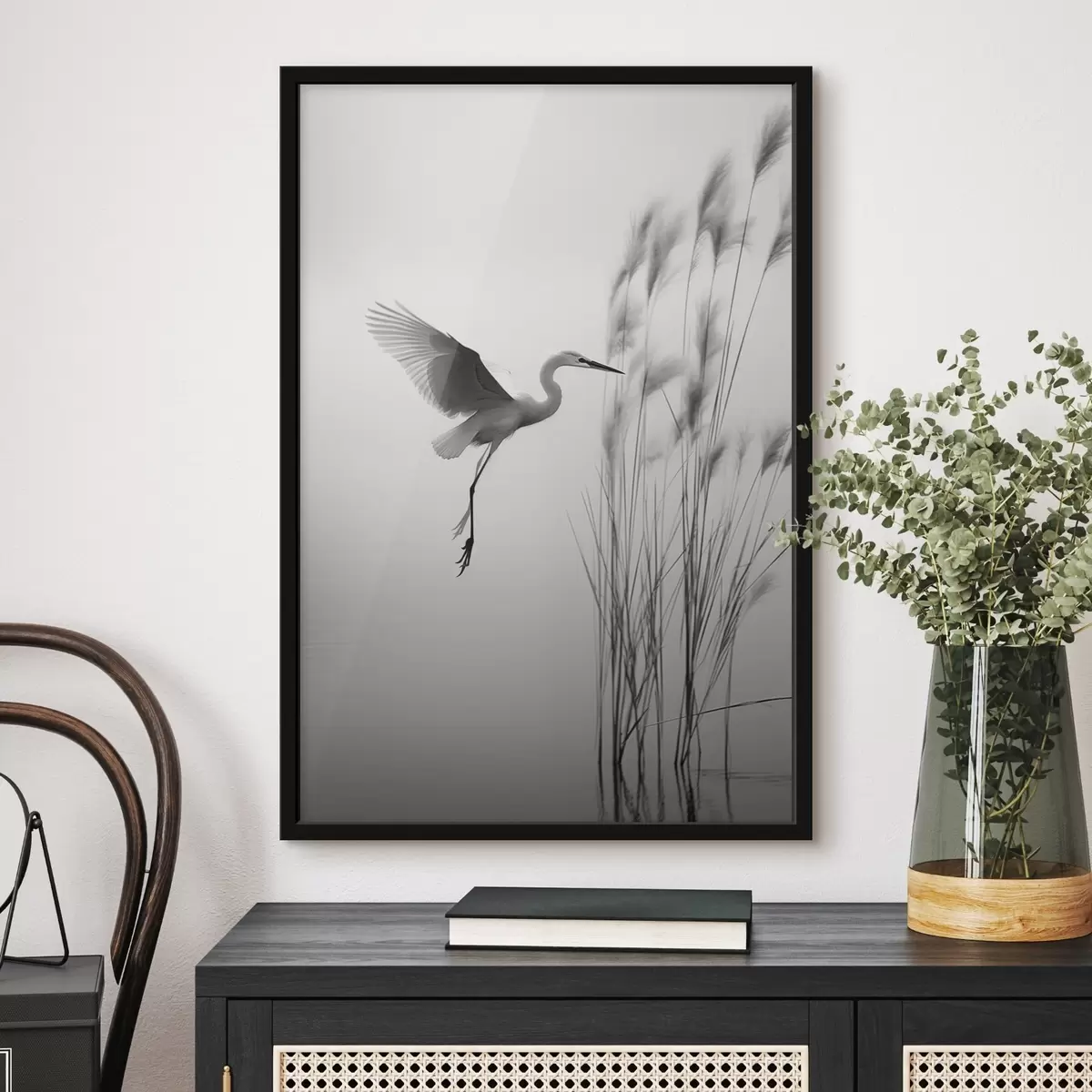 Poster Ein weißer Reiher mit ausgebreiteten Flügeln, der in der Nähe von hohen Schilfpflanzen fliegt, minimalistische Komposition in Schwarz und Weiß Nr f46693