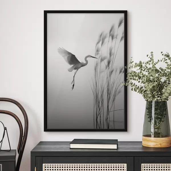 Poster Ein weißer Reiher mit ausgebreiteten Flügeln, der in der Nähe von hohen Schilfpflanzen fliegt, minimalistische Komposition in Schwarz und Weiß f46693