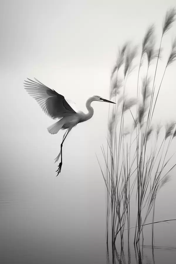 Poster Ein weißer Reiher mit ausgebreiteten Flügeln, der in der Nähe von hohen Schilfpflanzen fliegt, minimalistische Komposition in Schwarz und Weiß f46693