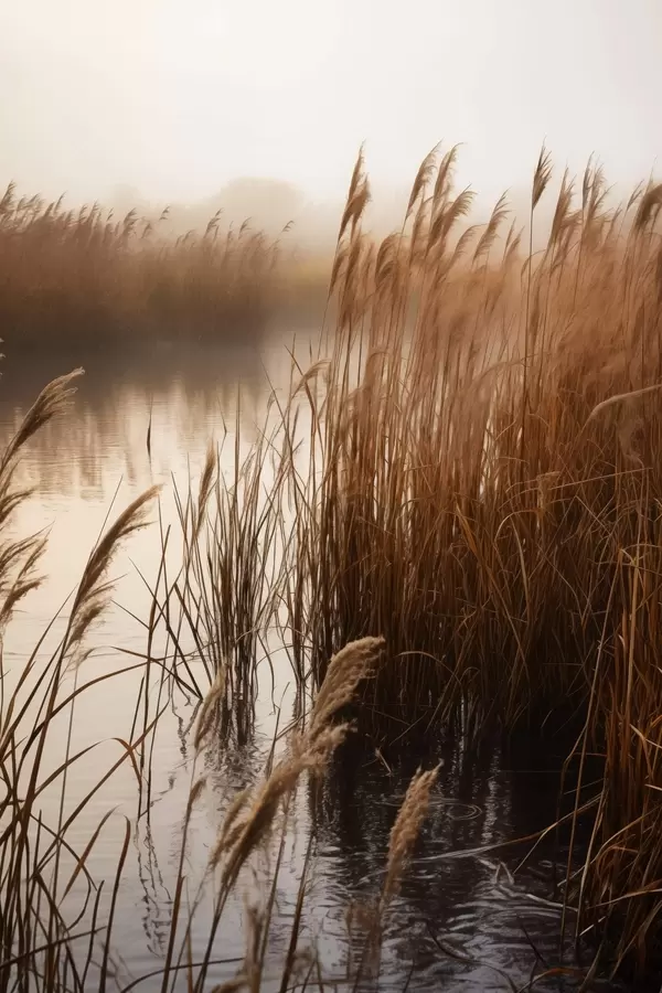 Poster Hohe Schilfpflanzen wachsen in einem Gewässer, das Wasser spiegelt die Schilfpflanzen wider, nebliger Hintergrund, sanftes Licht, Naturszene f46695