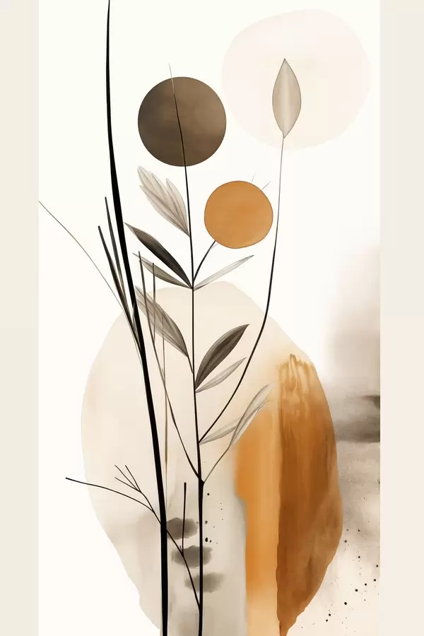 Poster Abstrakte Malerei-Imitation mit orangefarbenen und grauen Kreisen, Blättern und Zweigen, moderner Stil, Aquarelleffekt Nr f46698