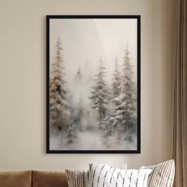 Poster Hohe, schneebedeckte Kiefern stehen in einem nebligen Wald, eine sanfte, gedämpfte Winterszene. f46701