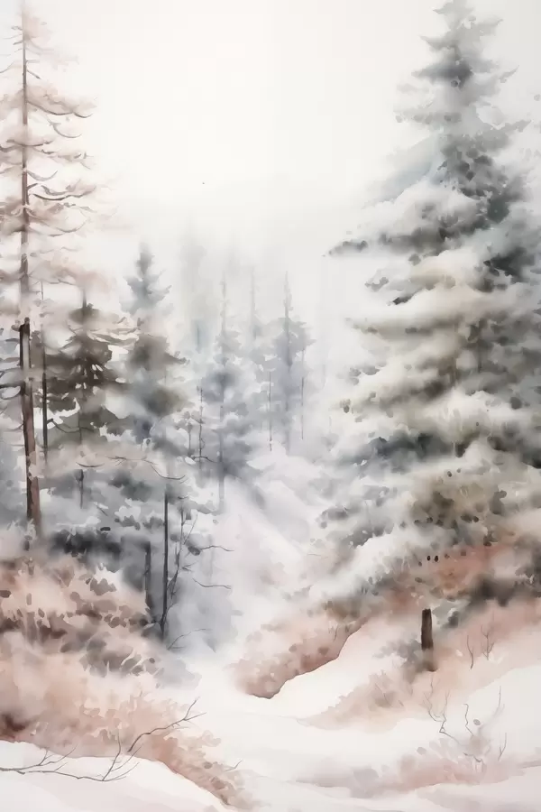Poster Hohe, schneebedeckte Kiefern stehen in einem nebligen Wald, eine sanfte, gedämpfte Winterszene. f46702
