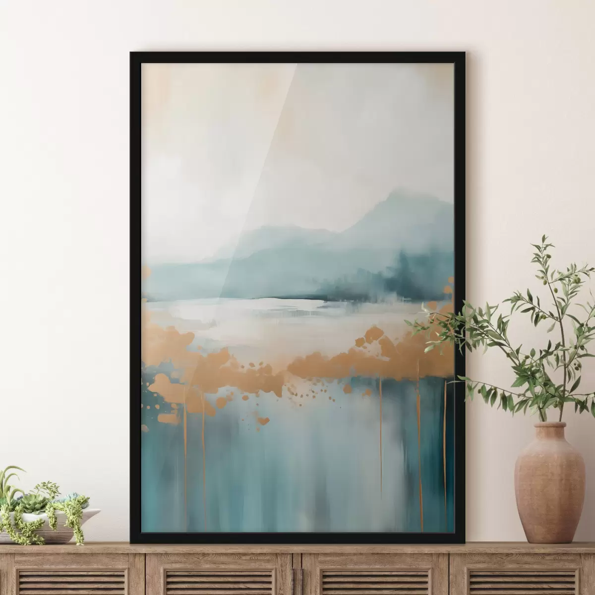 Poster Abstrakte Landschaft mit Bergen und See in Blaugrün und strukturiertem Gelb, weiche Pinselstriche, minimalistisches Kunstwerk Nr f46703