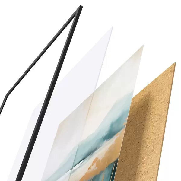 Das Poster besteht aus einem Rahmen, Plexiglas, einem gedruckten Bild und einer Rückwand aus Spanplatten. Dank der Halterungen auf der Rückseite kann das Poster sofort an die Wand gehängt werden.