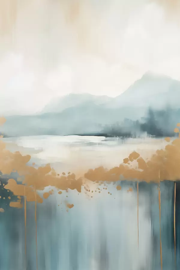 Poster Abstrakte Landschaft mit Bergen und See in Blaugrün und strukturiertem Gelb, weiche Pinselstriche, minimalistisches Kunstwerk Nr f46703