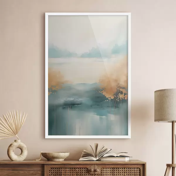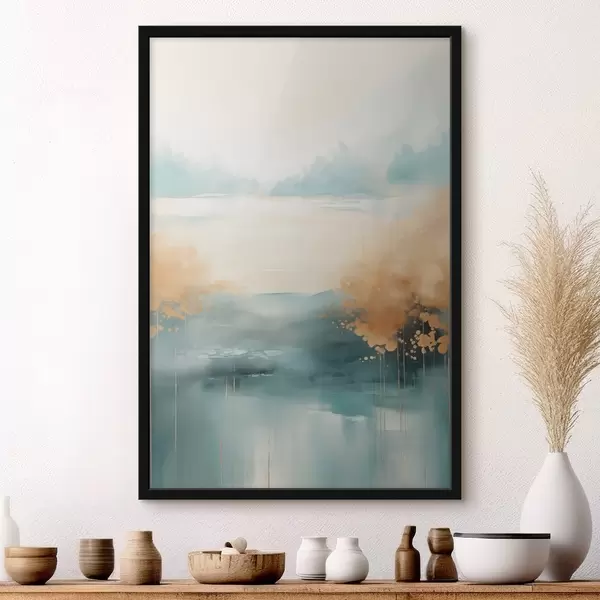 Poster Abstrakte Landschaft mit Bergen und See in Blaugrün und strukturiertem Gelb, weiche Pinselstriche, minimalistisches Kunstwerk Nr f46704