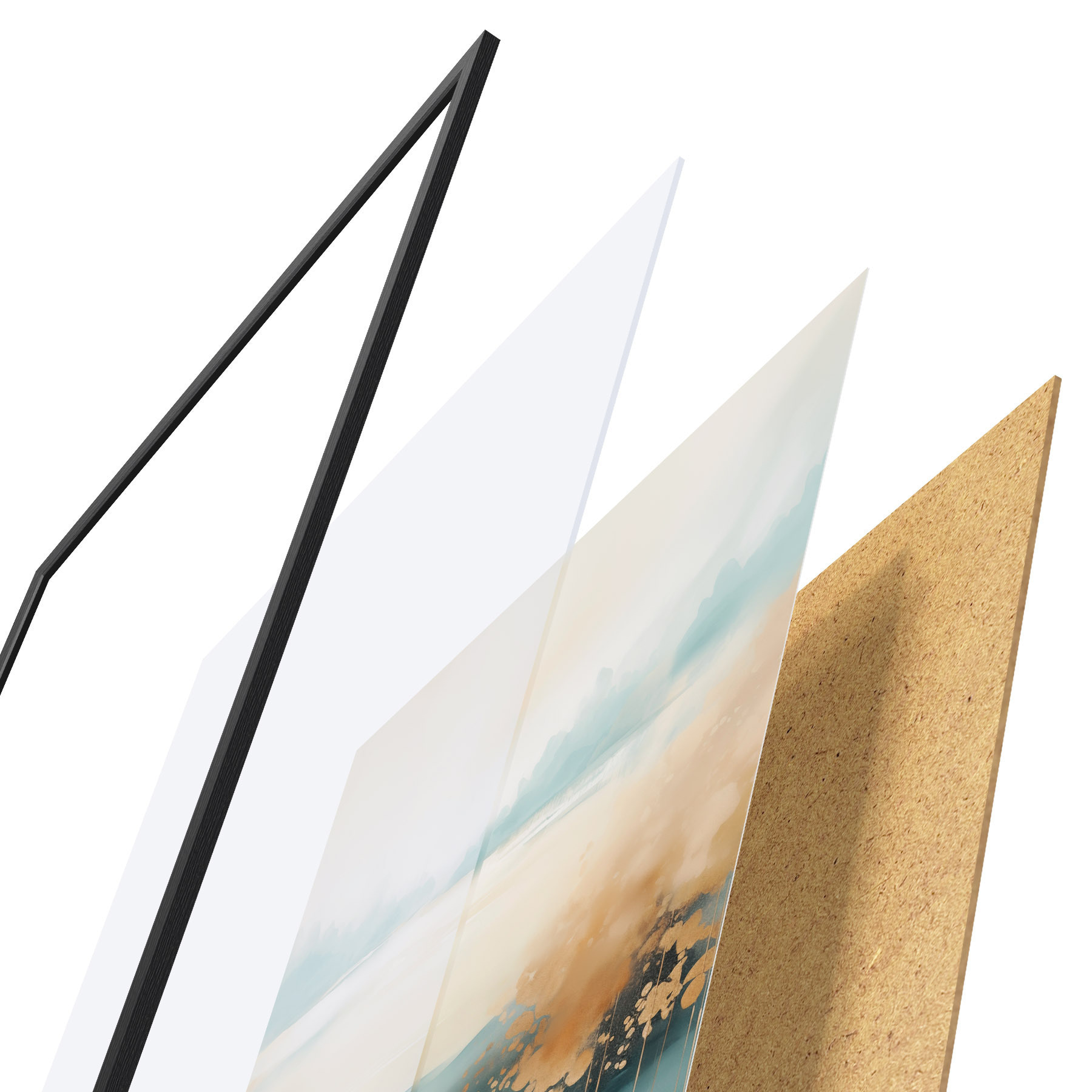Das Poster besteht aus einem Rahmen, Plexiglas, einem gedruckten Bild und einer Rückwand aus Spanplatten. Dank der Halterungen auf der Rückseite kann das Poster sofort an die Wand gehängt werden.