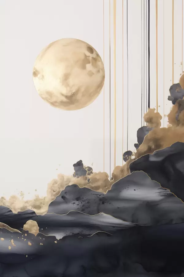 Poster Vollmond mit schwarzen und strukturierten gelben Wolken, vertikalen Linien, abstrakter Stil, minimalistisch und modern Nr f46707