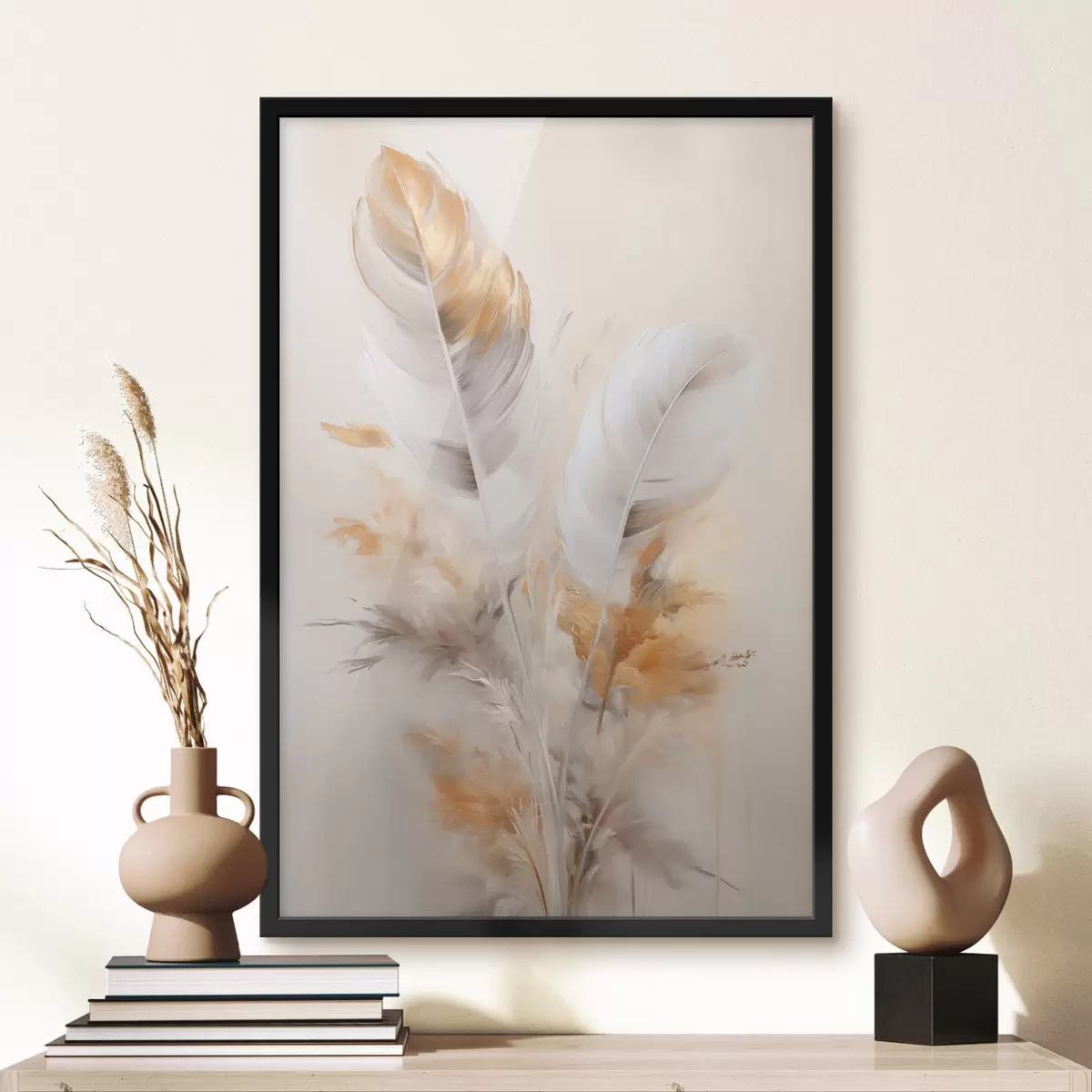 Poster Abstrakte Federn, umgeben von beigen und braunen Federn, weich und zart, auf hellbeigem Hintergrund Nr f46711