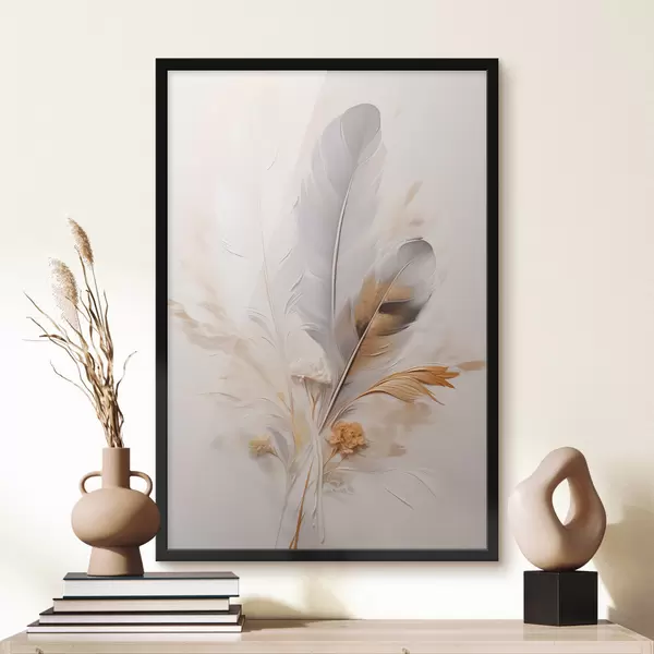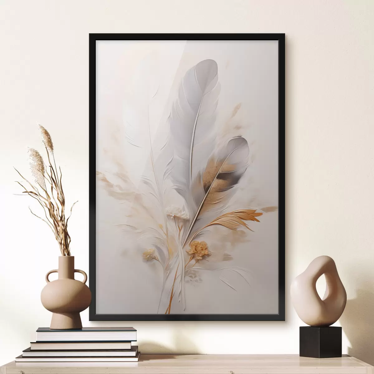 Poster Abstrakte Federn, umgeben von beigen und braunen Federn, weich und zart, auf hellbeigem Hintergrund Nr f46712