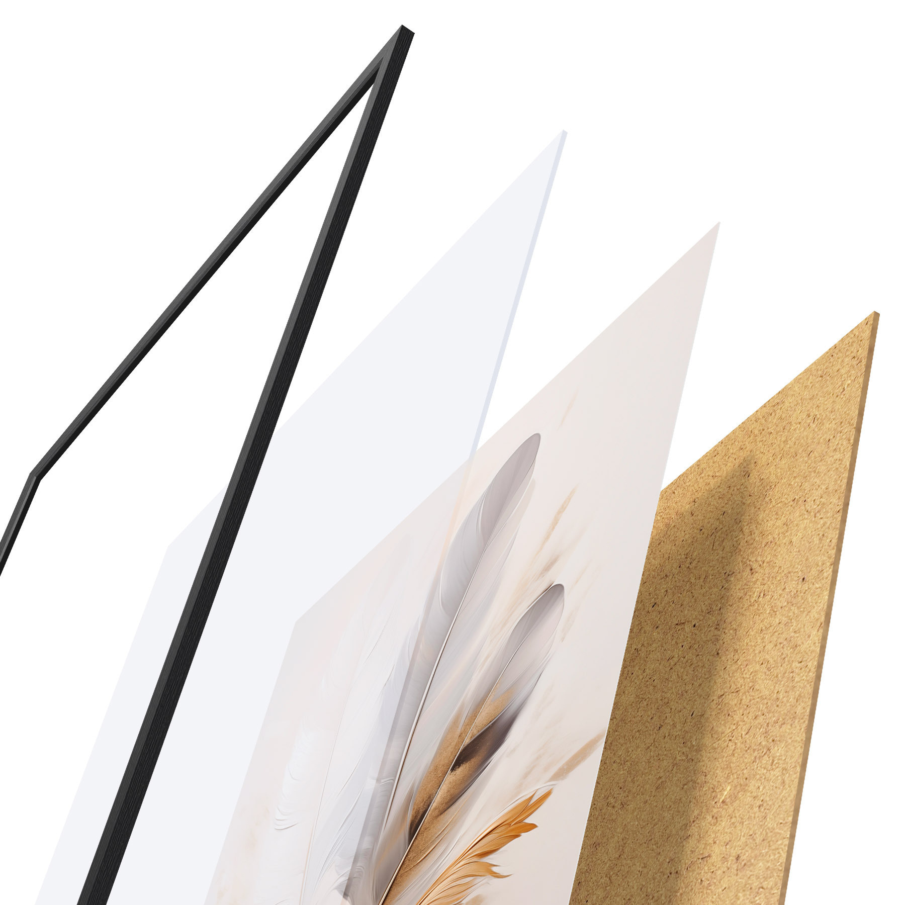 Das Poster besteht aus einem Rahmen, Plexiglas, einem gedruckten Bild und einer Rückwand aus Spanplatten. Dank der Halterungen auf der Rückseite kann das Poster sofort an die Wand gehängt werden.