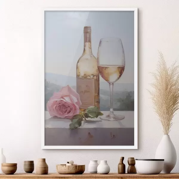 Poster Eine Flasche und ein Glas Wein und ein kleiner Hund mit Brille, Gemäldeimitation Nr f46721