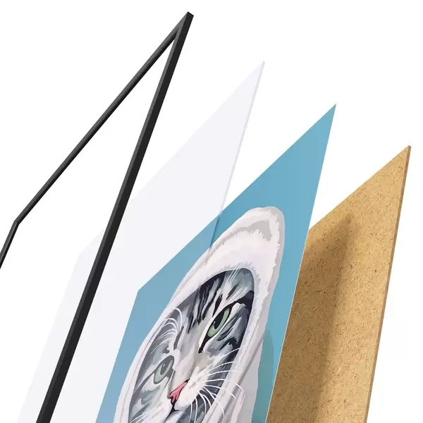 Das Poster besteht aus einem Rahmen, Plexiglas, einem gedruckten Bild und einer Rückwand aus Spanplatten. Dank der Halterungen auf der Rückseite kann das Poster sofort an die Wand gehängt werden.
