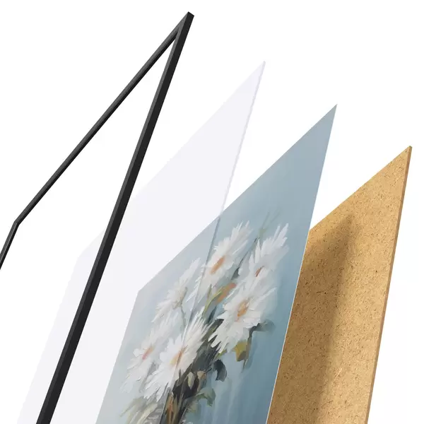 Das Poster besteht aus einem Rahmen, Plexiglas, einem gedruckten Bild und einer Rückwand aus Spanplatten. Dank der Halterungen auf der Rückseite kann das Poster sofort an die Wand gehängt werden.
