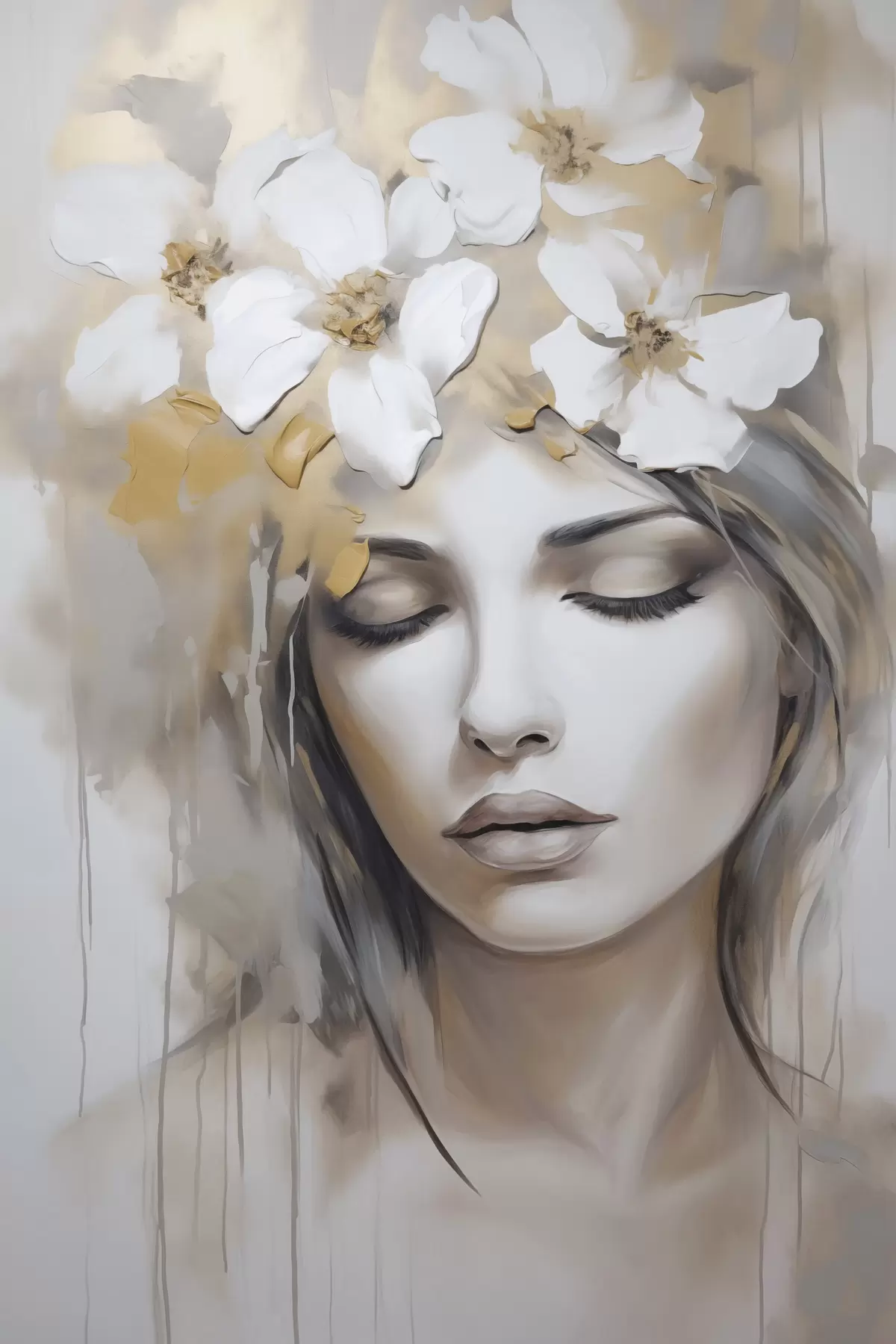 Poster Abstraktes Porträt eines Mädchens mit Blumen, Nachahmung eines Gemäldes Nr f46756