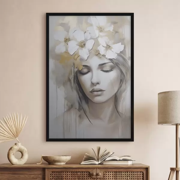 Poster Abstraktes Porträt eines Mädchens mit Blumen, Nachahmung eines Gemäldes f46756