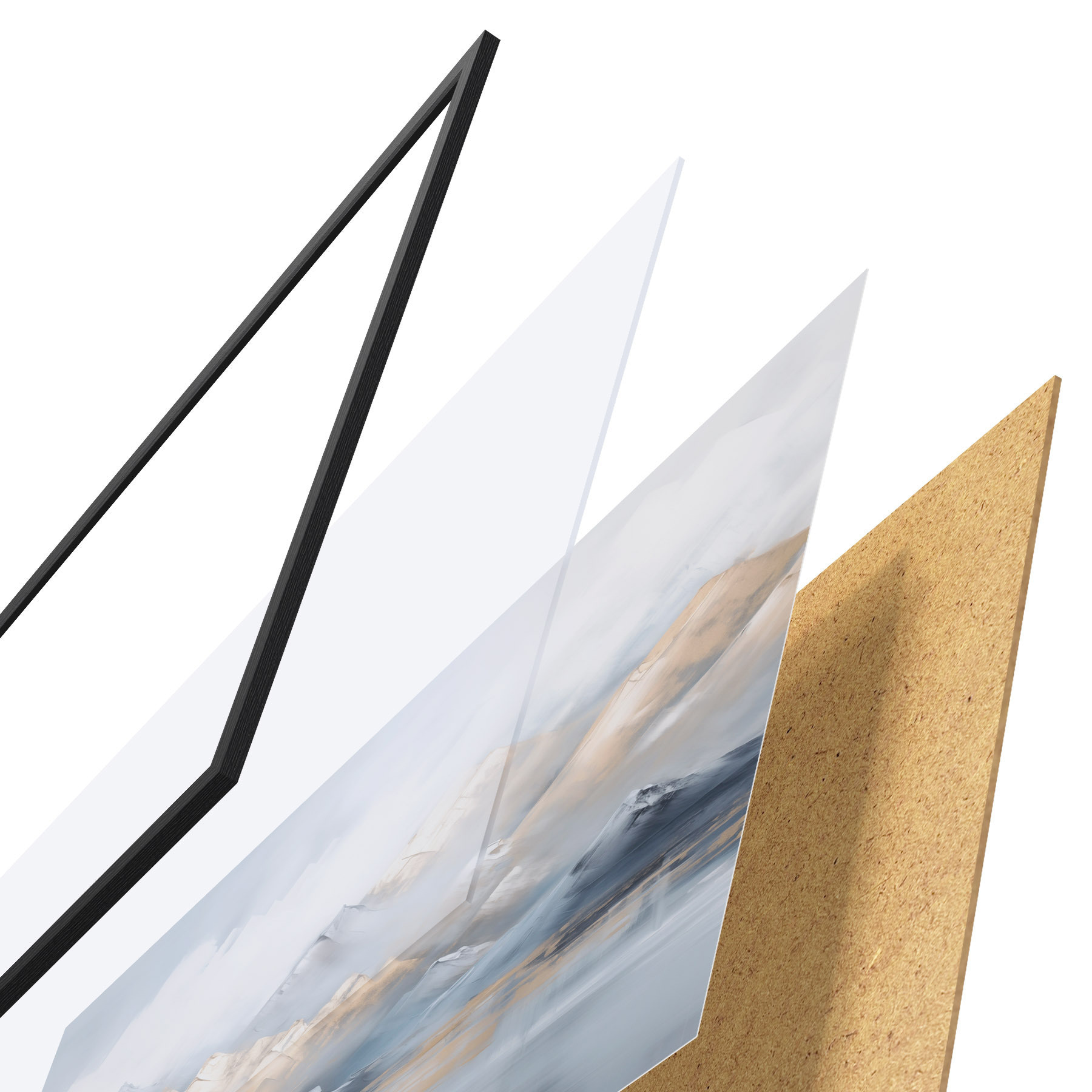 Das Poster besteht aus einem Rahmen, Plexiglas, einem gedruckten Bild und einer Rückwand aus Spanplatten. Dank der Halterungen auf der Rückseite kann das Poster sofort an die Wand gehängt werden.