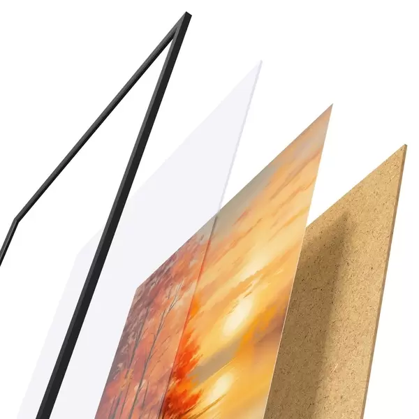 Das Poster besteht aus einem Rahmen, Plexiglas, einem gedruckten Bild und einer Rückwand aus Spanplatten. Dank der Halterungen auf der Rückseite kann das Poster sofort an die Wand gehängt werden.