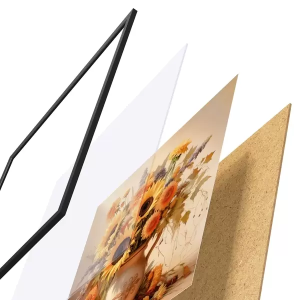 Das Poster besteht aus einem Rahmen, Plexiglas, einem gedruckten Bild und einer Rückwand aus Spanplatten. Dank der Halterungen auf der Rückseite kann das Poster sofort an die Wand gehängt werden.