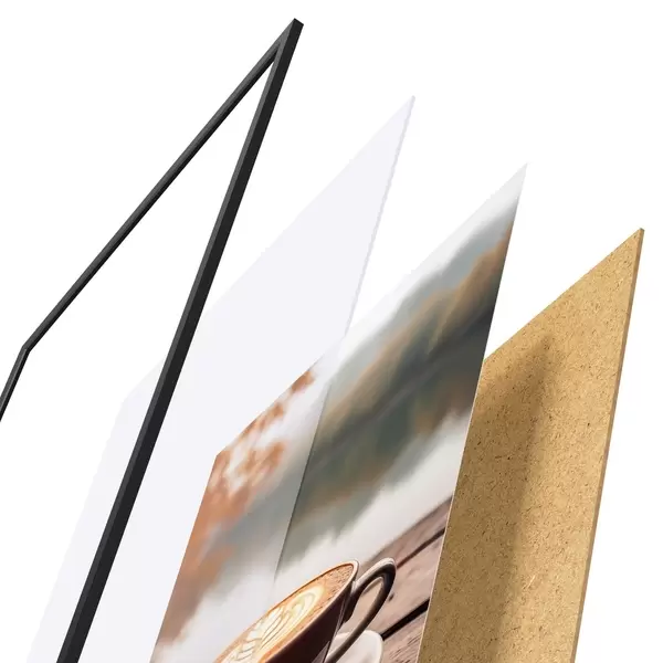 Das Poster besteht aus einem Rahmen, Plexiglas, einem gedruckten Bild und einer Rückwand aus Spanplatten. Dank der Halterungen auf der Rückseite kann das Poster sofort an die Wand gehängt werden.